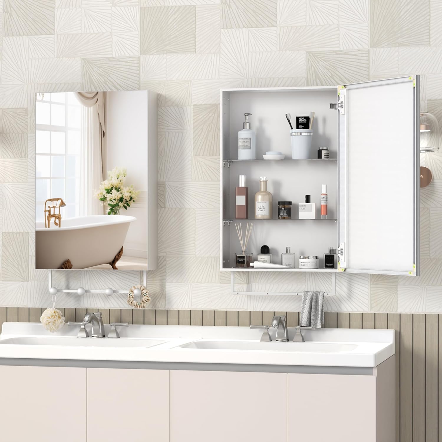 | Additional Features | 24"x16" Medicine Cabinet, Adjustable Shelf, Fade Resistant, Moisture Resistant, Removable Hooks |