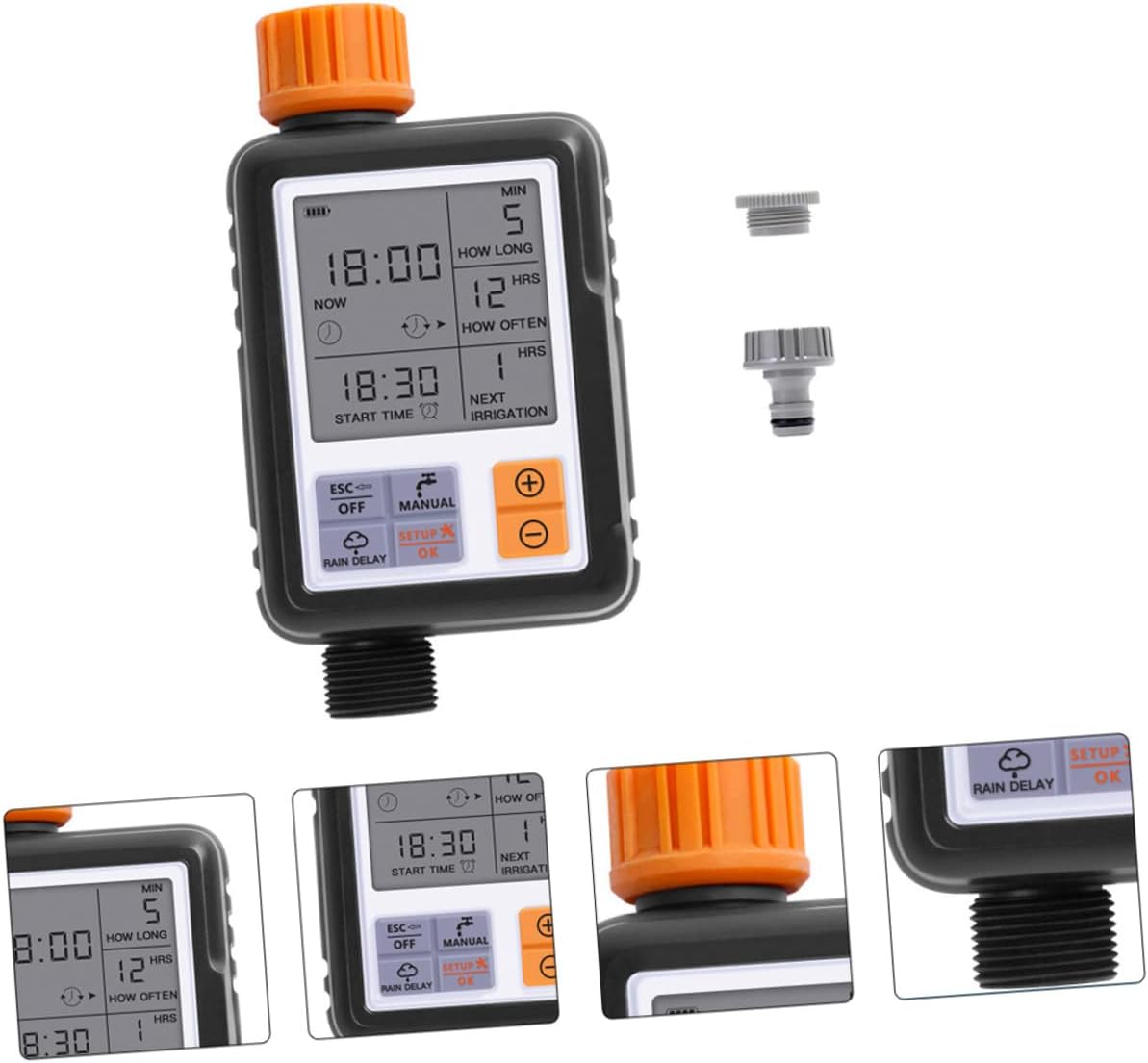Package List 1 set x automatic water timer kit Characteristics -Material: Plastic irrigation timer controller. -Product Info:Automatic flower waterer -Color:Black water sprinkler timer -Water Inlet: 3/4" internal thread timer automatic irrigation. -Water Outlet: 3/4" outer thread sprinkler controller. -Size: About 16.00X5.50X8.00cm/6.29X2.16X3.14in irrigation timer system. - Battery: 2 x AA batteries(Not included) automatic irrigation timer. - The higher capacity of pressure endurance frees you of worries of internal leakage and contributes to much power saving, greatly prolonging the product life automatic irrigation controllers. - The 3/4" universal thread and matches most hose faucets, which is very convenient to use intelligent timed irrigation controller. - Its protection grade reaches IP65 and the superior waterproof and properties garden water timer. - This heavy-duty garden timer is made of material, the exterior and interior are specially designed for leaking prevention irrigation timer. - The solenoid valves of watering timer adopts new components so that it can withstand water pressure of 8-10kg automatic water timer.Goods Descriptionintelligent timed irrigation controller A large screen display makes it very convenient for you.water sprinkler timer You can set the watering time you need, which is perfect for home and garden use.irrigation timer system This is a gardening watering timer for your flower and plants.irrigation timer controller Made of material, it is durable for long time use