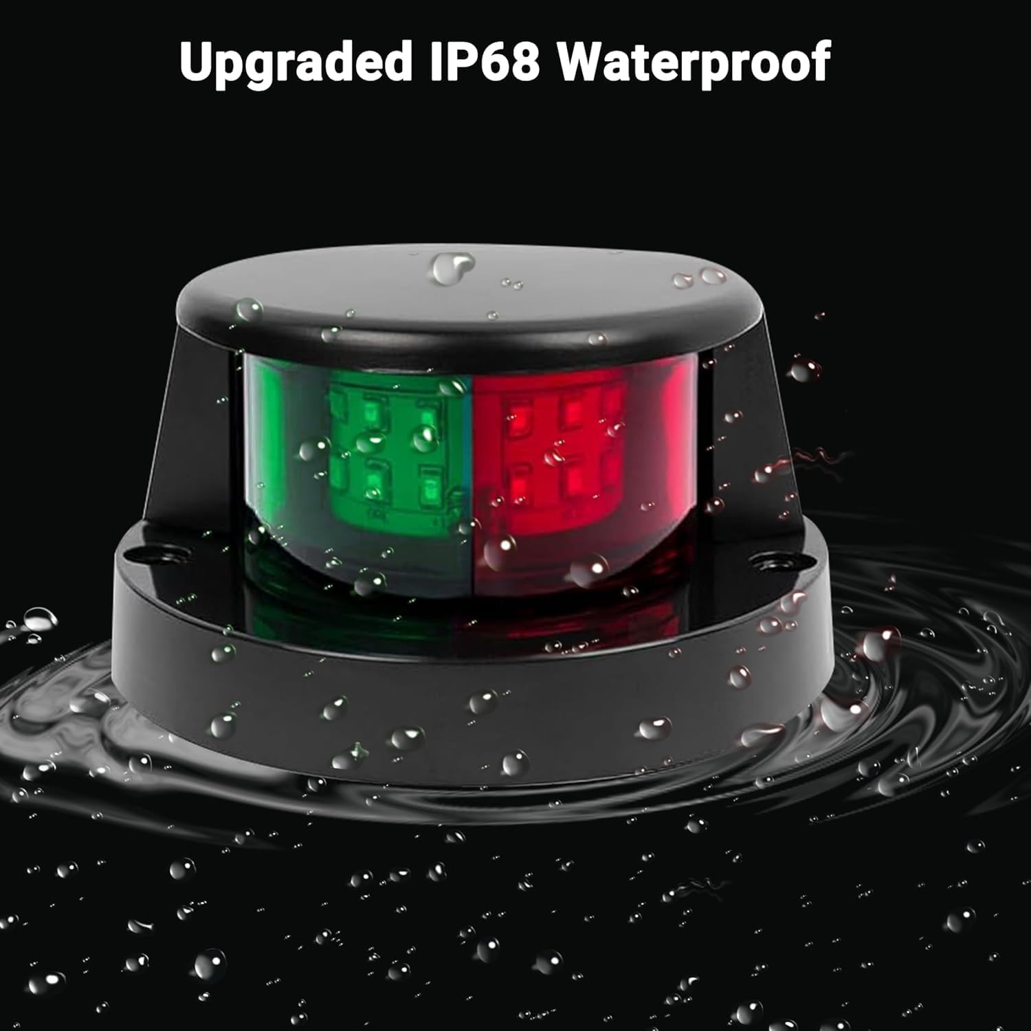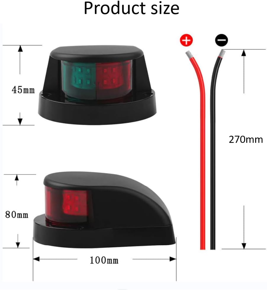 12V LED Boat Navigation LightsFeatures:1. Red and green LED integrated ship side lights, DC 12V power supply, red on the port side and green on the starboard side, can be used as bow lights and tail lights. Bright LEDs provide simple and effective marine safety lighting with low power consumption;2. 12 LEDs (6 red + 6 green), radiation angle - 225 degrees, high light brightness and large illumination angle;3. IP68 waterproof: no need to worry about heavy rain or strong wind, can withstand heavy rain or strong wind during sailing.Specifications:Material: PC Lens+ABS Base+Chrome HousingColor: BlackLED Quantity: 6pcs(Red)+6pcs(green)LED Type: 5050 SMDWaterproof: IP67Voltage: 12V-24V( DC)Power: 6 WattsDimension: 3.94''x3.14''x1.77''Product weight: 500g/pcsWorking Hours: 50,000 hoursWire Connection: Black - Negative; Red - PositivePackage Included:1xRed&green boat lights2xMounting screws1xManual