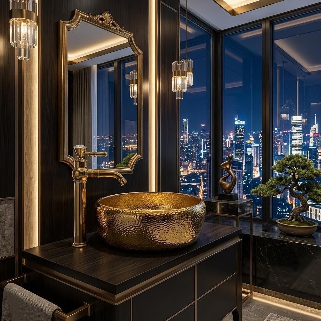 Transform your bathroom into a luxurious sanctuary with this stunning gold vessel sink. The round ceramic basin features a polished finish with an elegant hammered texture that catches the light beautifully. Measuring 15.8 inches in diameter and 5.9 inches in height, this classic-styled sink makes a bold statement while providing ample space for daily use. The wall-mount installation option and pop-up drain compatibility offer modern convenience. The durable ceramic construction with its sophisticated gold finish creates a perfect balance of functionality and style. Designed for single-hole faucet installation, this sink pairs wonderfully with contemporary bathroom fixtures. The bowl-shaped design and polished interior ensure smooth water flow and easy cleaning - simply use mild soap and water to maintain its lustrous appearance. At 8.5 pounds, this sink combines sturdy construction with sophisticated design, making it an ideal centerpiece for your bathroom renovation.