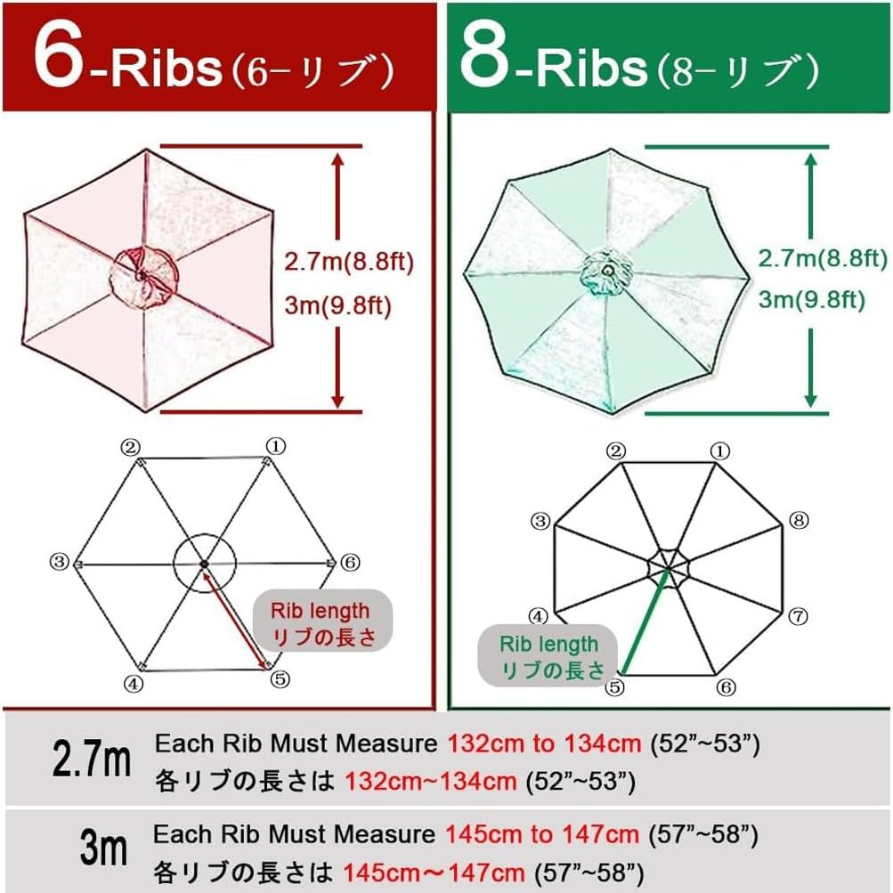 Welcome to our store, I wish you a happy shopping!The outdoor replacement umbrella covers are made of polyester material that is fade resistant and easy to clean. protection in sunny days, waterproof in rainy days. Always keep you covered.The simple makes the canopy easy to carry and remove, simply place the poles individually into the pocket at the end of the canopy.Umbrella Fabric Cover suitable for most common umbrellas for a wide range of applications. for patios, patios, swimming pools and more.▶Product Description:Name: Replacement Parasol Canopy CoverMaterial: Polyester fabricColor: Color: white , Khaki , Red , Black , Green,lake blue,burgundy,navy blueSize: 2m/6.6ft, 2.7m/8.9ft, 300cm/9.8ftFits: 6 ribs/8 ribs, wood, steel and aluminum umbrella stand.▶Packing List:1 x Replacement umbrella cloth▶Measurement methods:--Umbrella cloth with a diameter of 2m is suitable for Arms with a length of 97 ~ 99cm (38 ~ 39inch)--Umbrella cloth with a diameter of 2.7m is suitable for Arms with a length of 132 ~ 135cm(52 ~ 53inch)--Umbrella cloth with a diameter of 300cm is suitable for Arms with a length of 145 ~ 147cm(57 ~ 58inch)▶Warm tips:1. Due to manual measurement, please allow a 1-2mm error and make sure you don't mind before ordering.2. Due to the different positions of the pictures, there may be color differences, please understand.