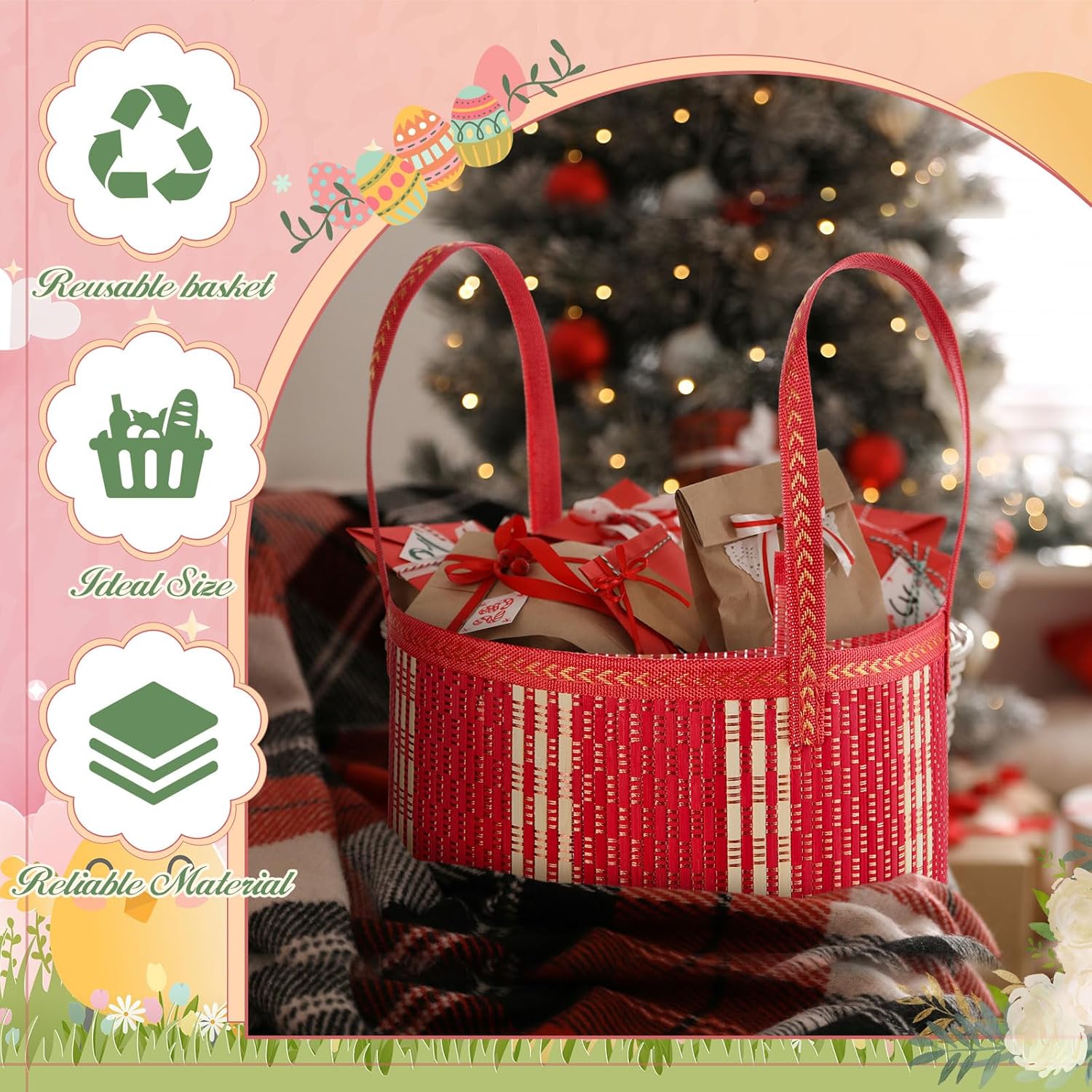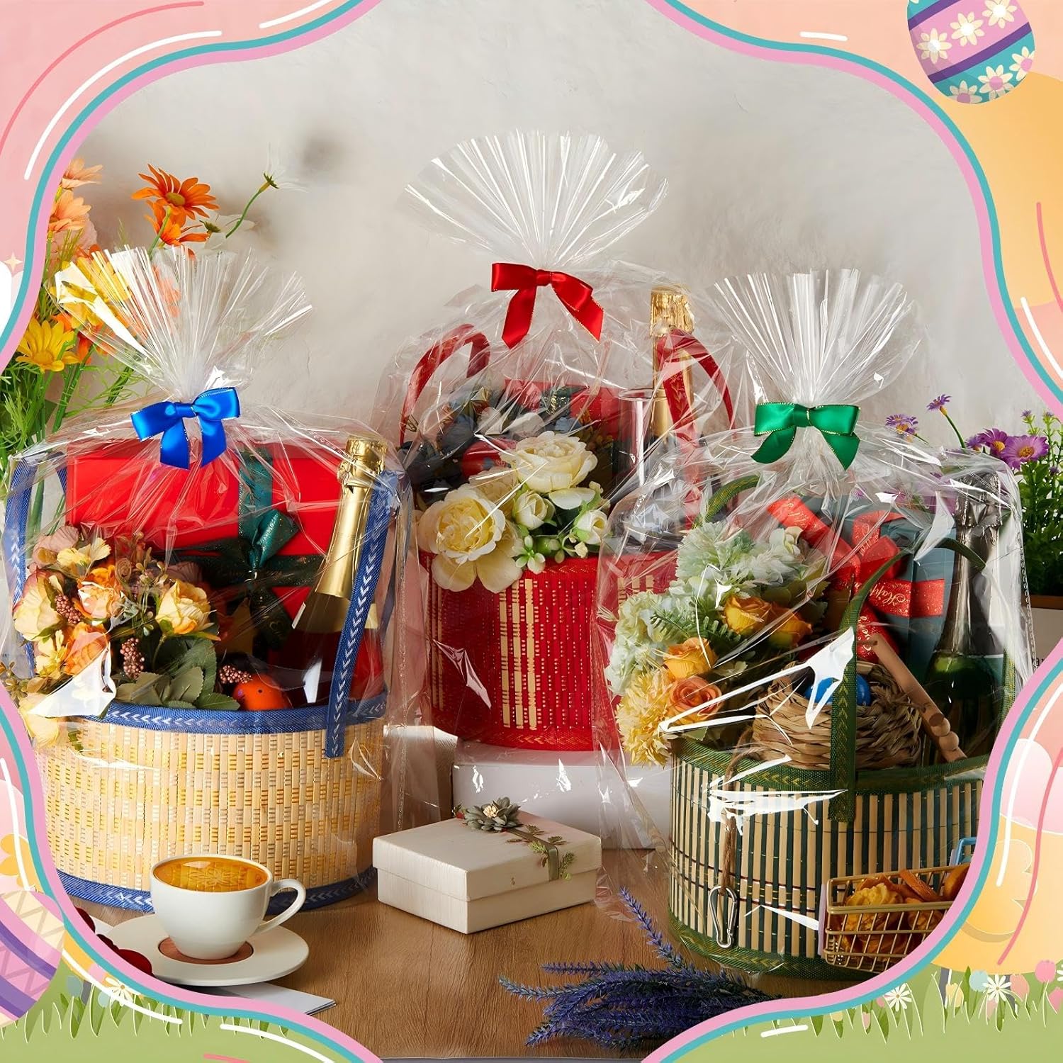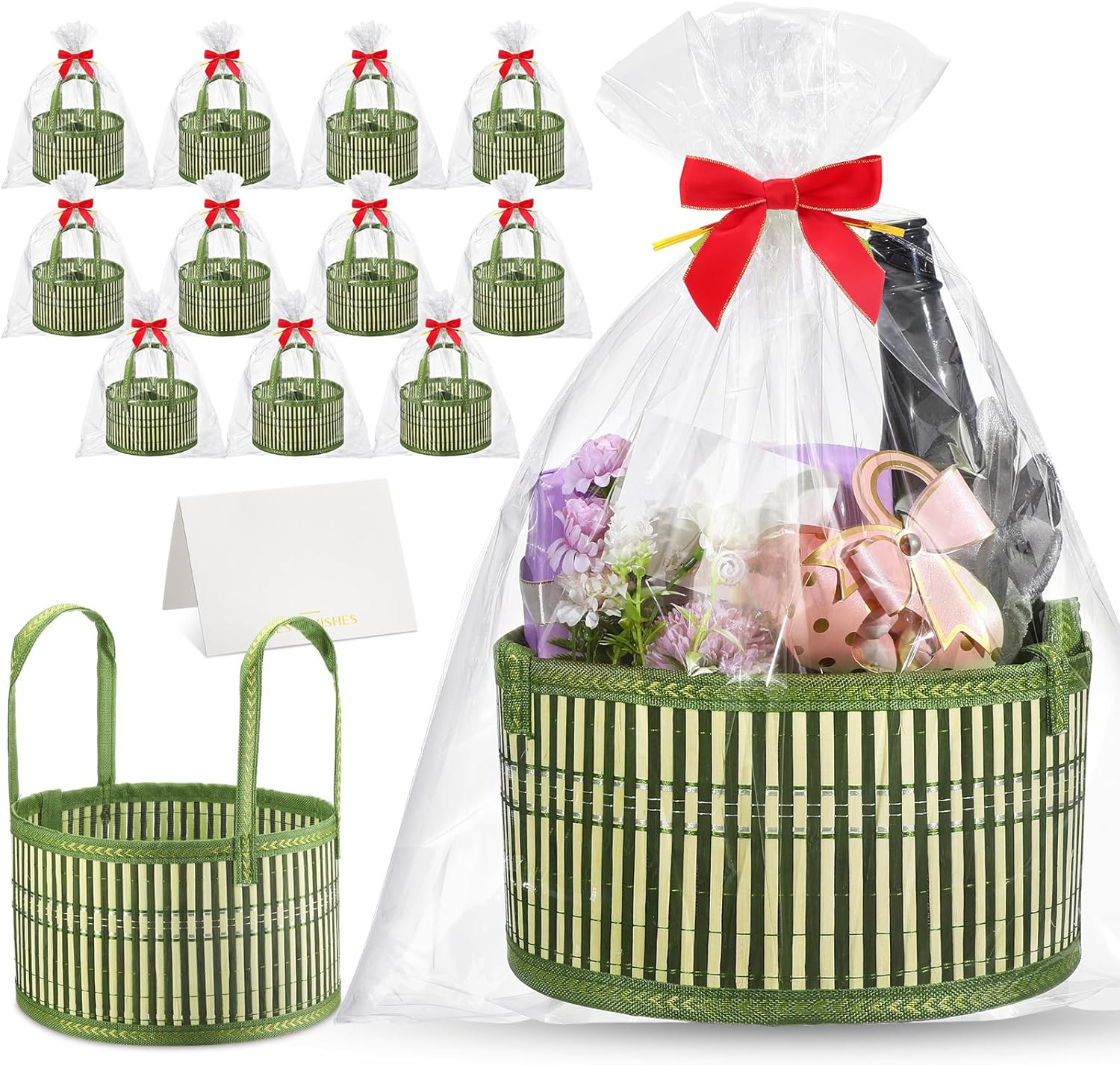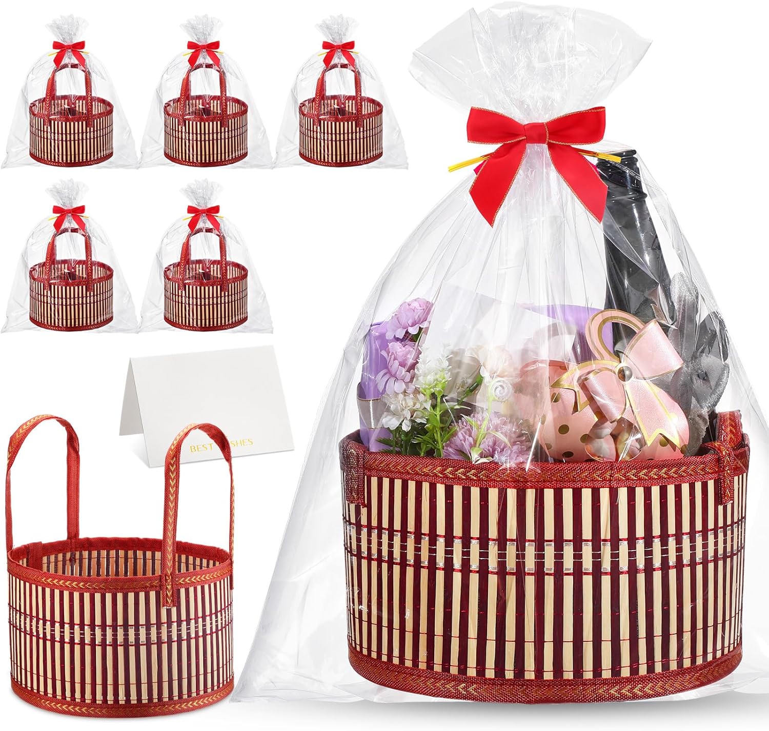 Features: Our gift basket set is easy to apply, you can place your gift on the basket, write your wishes on the card and place it in the basket, place the basket in the bag and seal it with a bow. You can also use these baskets for serving to hold food, such as fruits, snacks, candies, bread, which can bringing a lot of convenience for your life. Specifications: Main material: bamboo and wood Color: multicolor Empty gift basket size: about 9.8 x 9.8 x 6.1 inches Transparent gift bag size: about 19.7 x 23.6 inches Package includes: 6 x Empty gift basket 6 x Transparent gift bag 10 x Gift card 6 x Bow Notes: Manual measurement, please allow slight errors on size. The color may exist a slight difference due to different screen displays